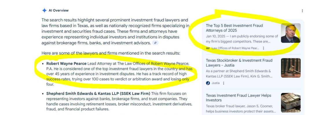 Look! I did a thing: #1 ranking nationwide for a law firm client of mine (still a work in progress, but not bad to see in Texas considering he’s based in Florida!). They call it: Answer Engine Optimization (AEO) … Read More
